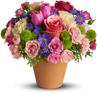 A warm terra-cotta pot and lots of fun colors give this bouquet an endearing country style. Equally apropos in a designer home or out on the picnic table, it makes a stylish housewarming gift, brightening everyone's day with its friendly blooms.